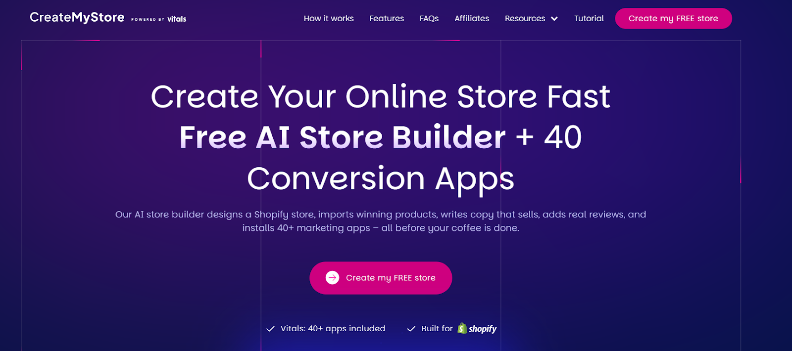 CreateMyStore.ai isn't just one app — it's an entire store-building ecosystem in a single flow. It uses AI to design your store's visual theme, write compelling product copy, pull in real customer reviews, and automatically install over 40 Vitals apps covering upsells, pop-ups, loyalty tools, urgency badges, and more. The theme itself was designed by Baymard-certified UX experts specifically to maximize conversions, so you're not just getting something that looks good — you're getting something that's proven to sell.